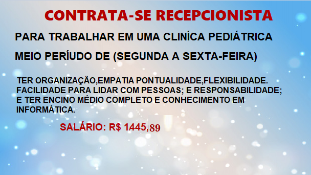 CONTRATA RECEPCIONISTA PARA TRABALHAR EM CLÍNICA PEDIÁTRICA. , VAGA: MEIO PERÍODO.
