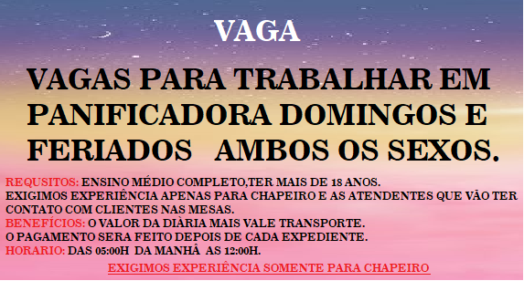 Panificadora Contrata pessoas para trabalhar domingo e feriados – Das 05:00 da manhã as 12:00 diária de