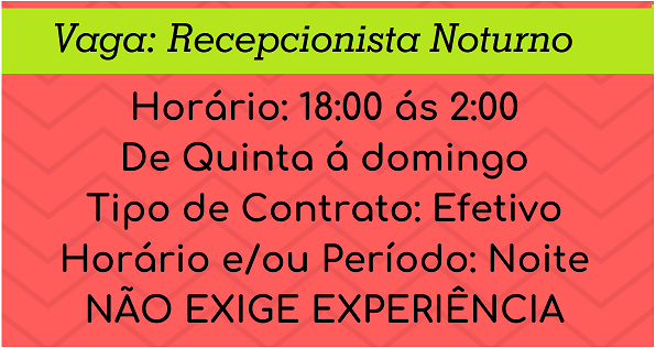 Vaga Para Recepcionista Noturno de hotel Área e especialização profissional: Atendente / Recepção Nível hierárquico: Auxiliar Recepção Atendimento ao cliente[…]