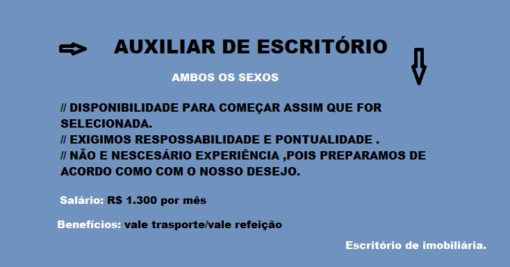 VAGA: Auxiliar administrativo Serão aceitos currículos somente que atenderem os requisitos. Descrição Código: 416250 Função: Auxiliar escritório Requisitos : Flexibilidade para aprender;[…]