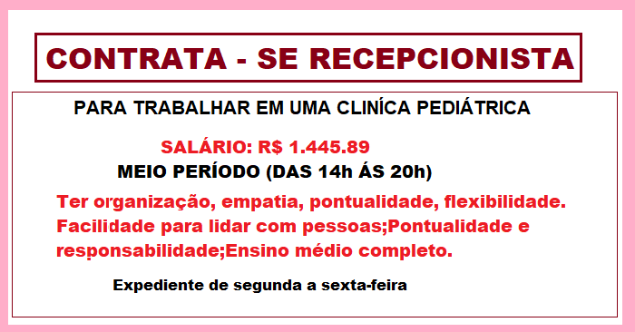 Clínica pediátrica seleciona profissional para trabalhar na função de recepcionista. Principais Atividades: Atendimento presencial e telefônico, administração da agenda de[…]